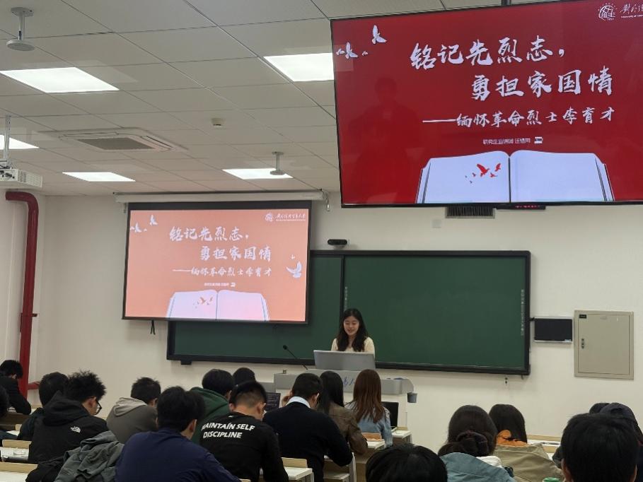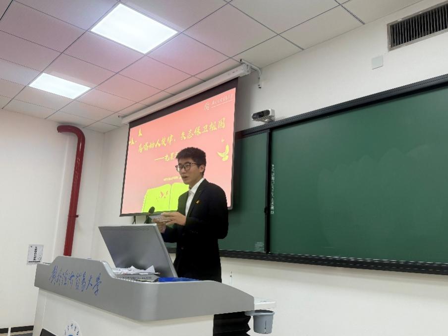 宣讲围绕抗战英雄的家书与事迹展开,激励青年学子从中汲取精神力量,厚植爱党爱国情怀。宣讲过程中,国际经济贸易学院杨砚成同学以《高唱动人旋律,矢志保卫祖国——冼星海家书》为题,展现了人民音乐家以音符为枪、用旋律鼓舞斗志的赤子之心;国际经济贸易学院汪韫珂同学带来的《铭记先烈志,勇担家国情——李育才家书》,深情讲述了革命先辈为国为民、舍生忘死的家国担当;保险学院李唯佳同学则通过《酷刑难摧英雄志,家书永载赤子心——金方昌家书》,生动再现了革命烈士坚贞不屈、视死如归的英雄气概。宣讲人声情并茂的诵读与深入浅出的讲解,使在场同学深受触动。