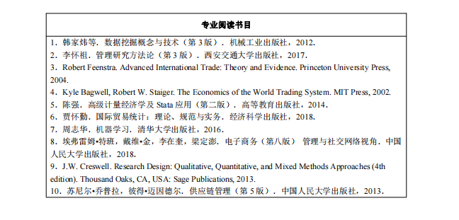6.有较强的文献阅读能力和科学研究能力,初步具备独立承担与专业研究相关工作的能力和创新能力,具备继续深造或者从事数字贸易及其相关领域研究的知识水平和学术潜质。